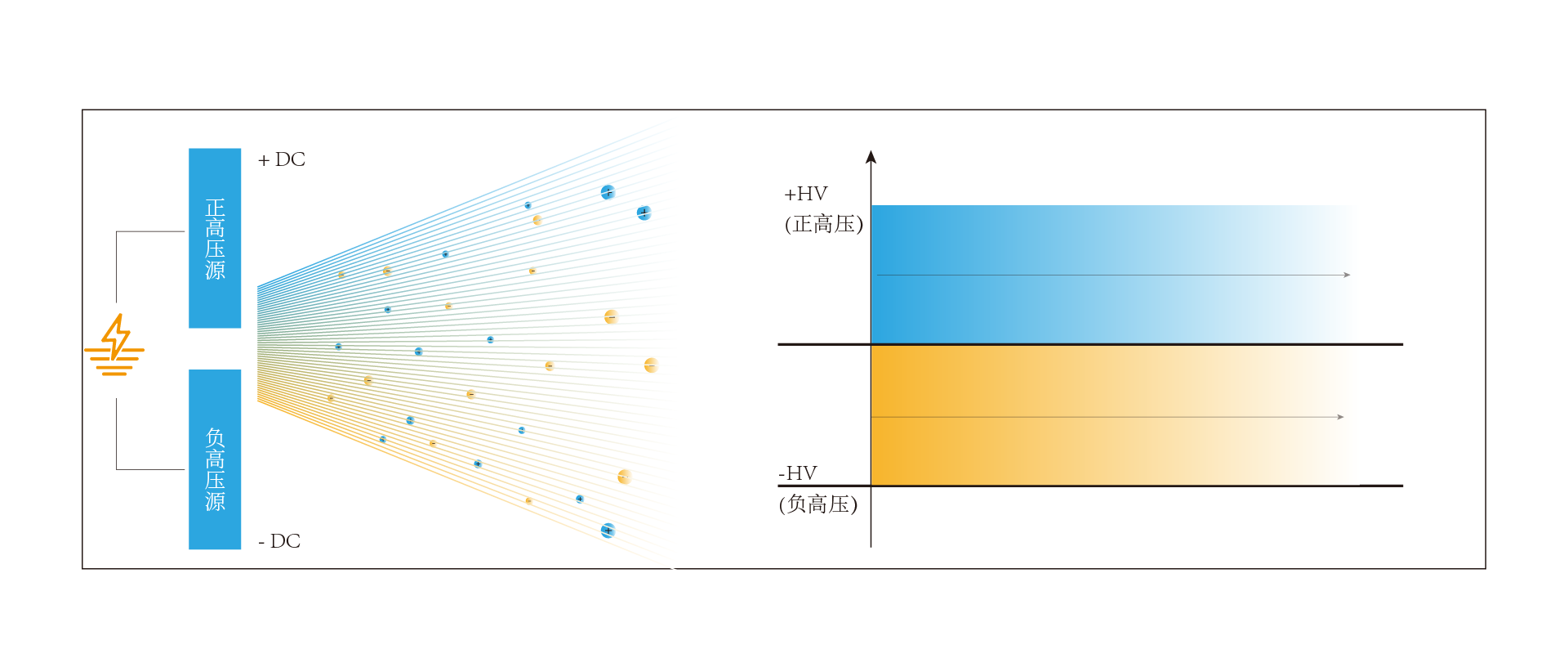 DC方式给2根电极针施加“+”“-”高压,生成两种极性离子的方式。离子产生利用率高,对外部的电磁干扰小,对净化环境的颗粒物污染程度影响小。