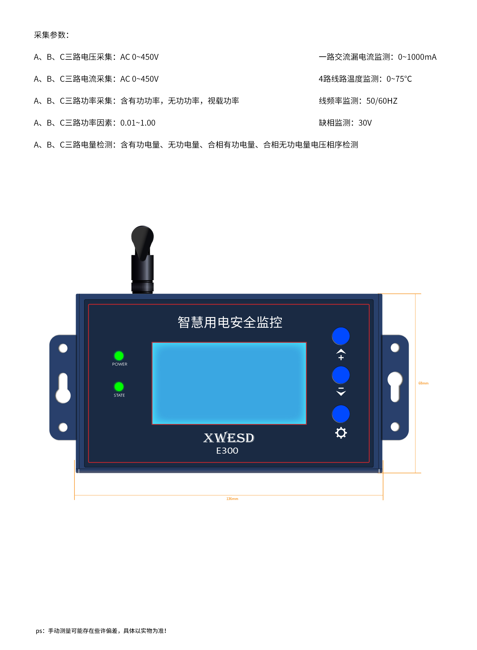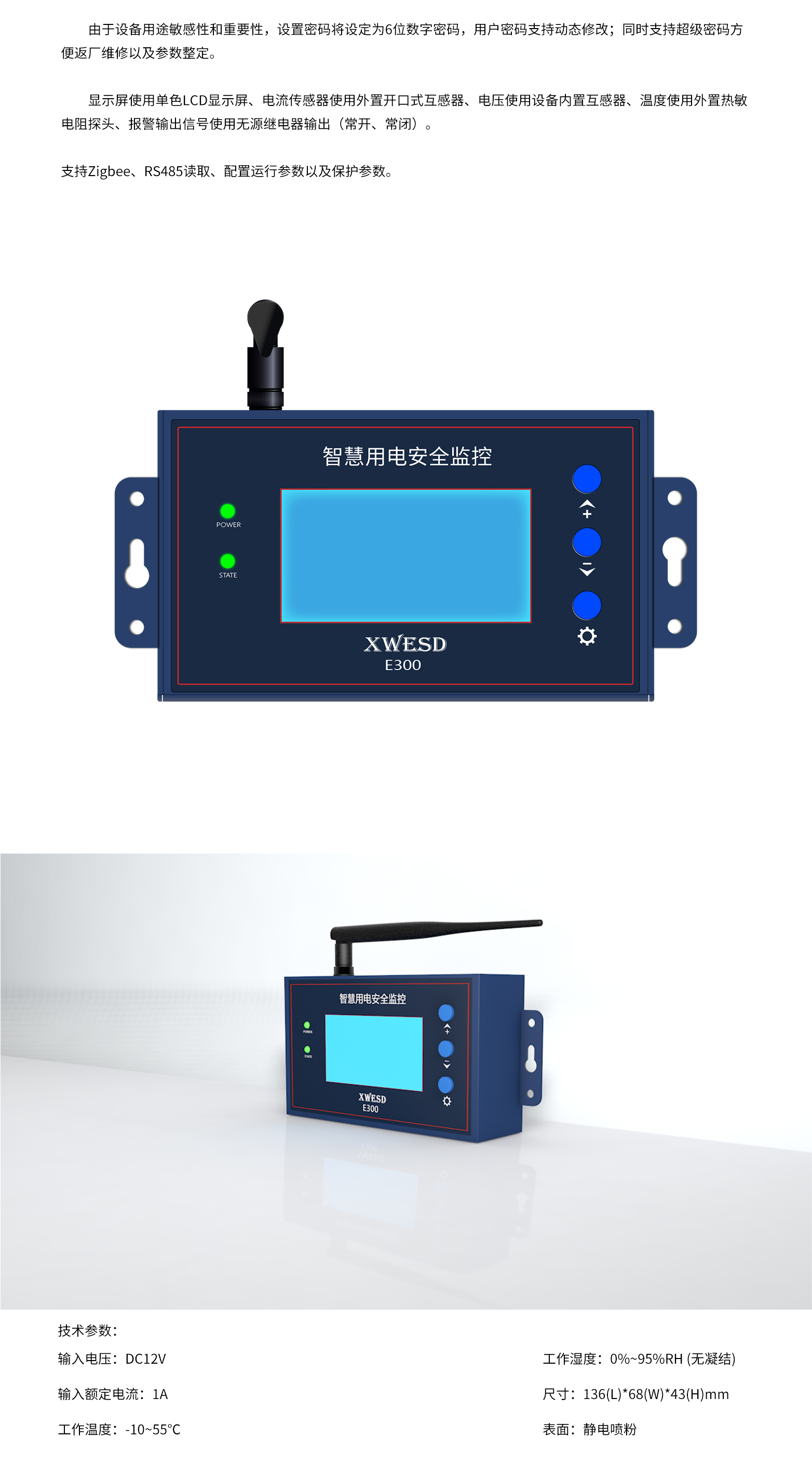 显示屏使用单色LCD显示屏、电流传感器使用外置开口式互感器、电压使用设备内置互感器、温度使用外置热敏电阻探头、报警输出信号使用无源继电器输出(常开、常闭)。