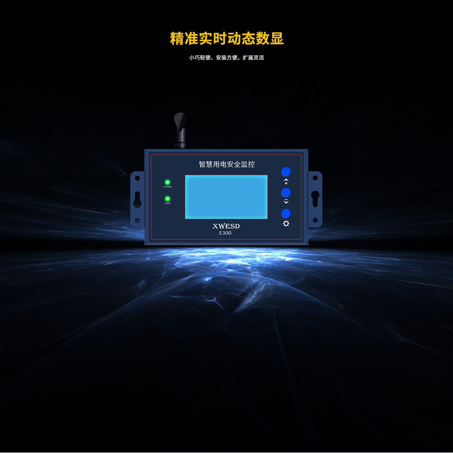 显示屏使用单色LCD显示屏、电流传感器使用外置开口式互感器、电压使用设备内置互感器、温度使用外置热敏电阻探头、报警输出信号使用无源继电器输出(常开、常闭)。