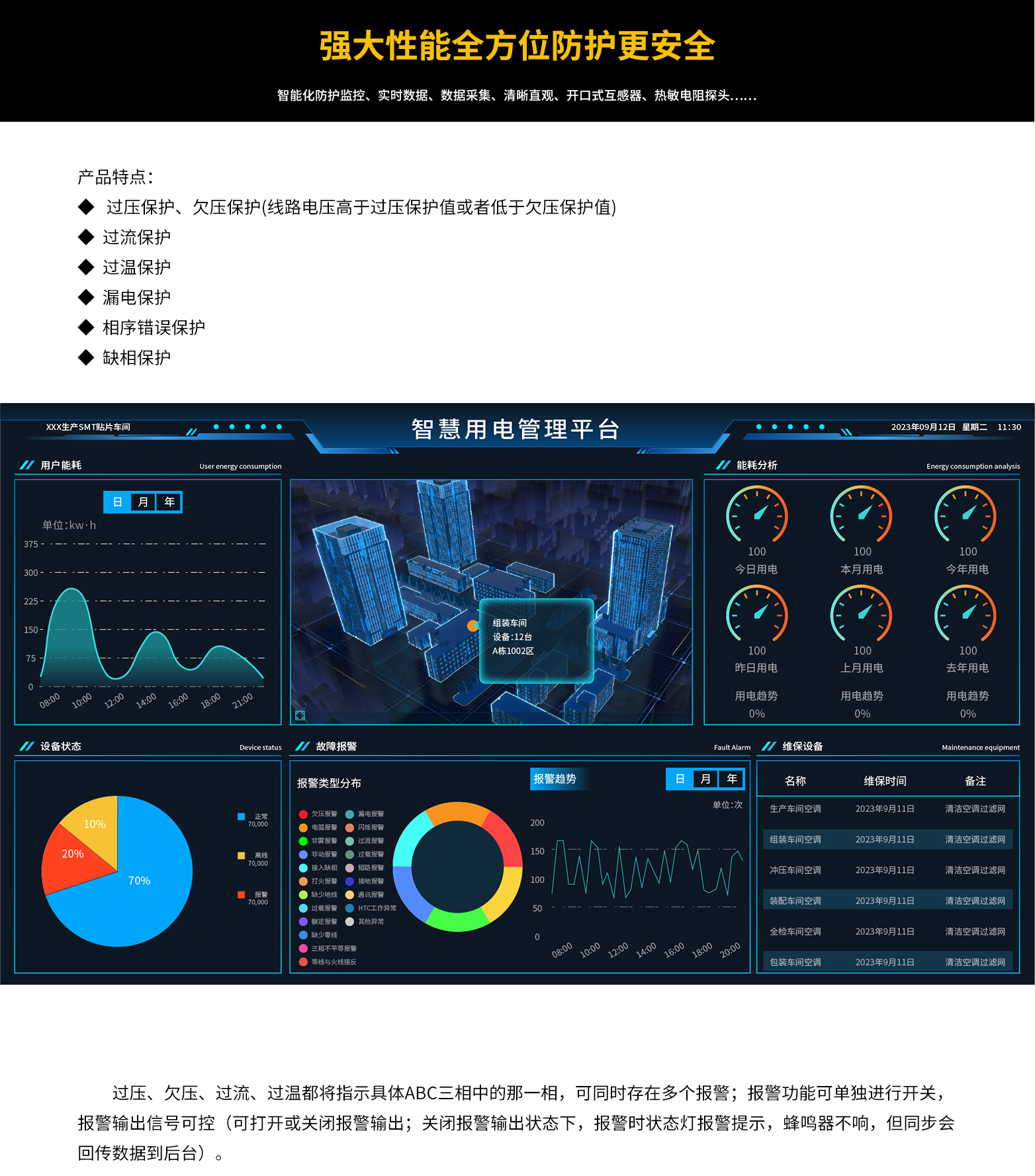 过压、欠压、过流、过温都将指示具体ABC三相中的那一相,可同时存在多个报警;报警功能可单独进行开关,报警输出信号可控(可打开或关闭报警输出;关闭报警输出状态下,报警时状态灯报警提示,蜂鸣器不响,但同步会回传数据到后台)。