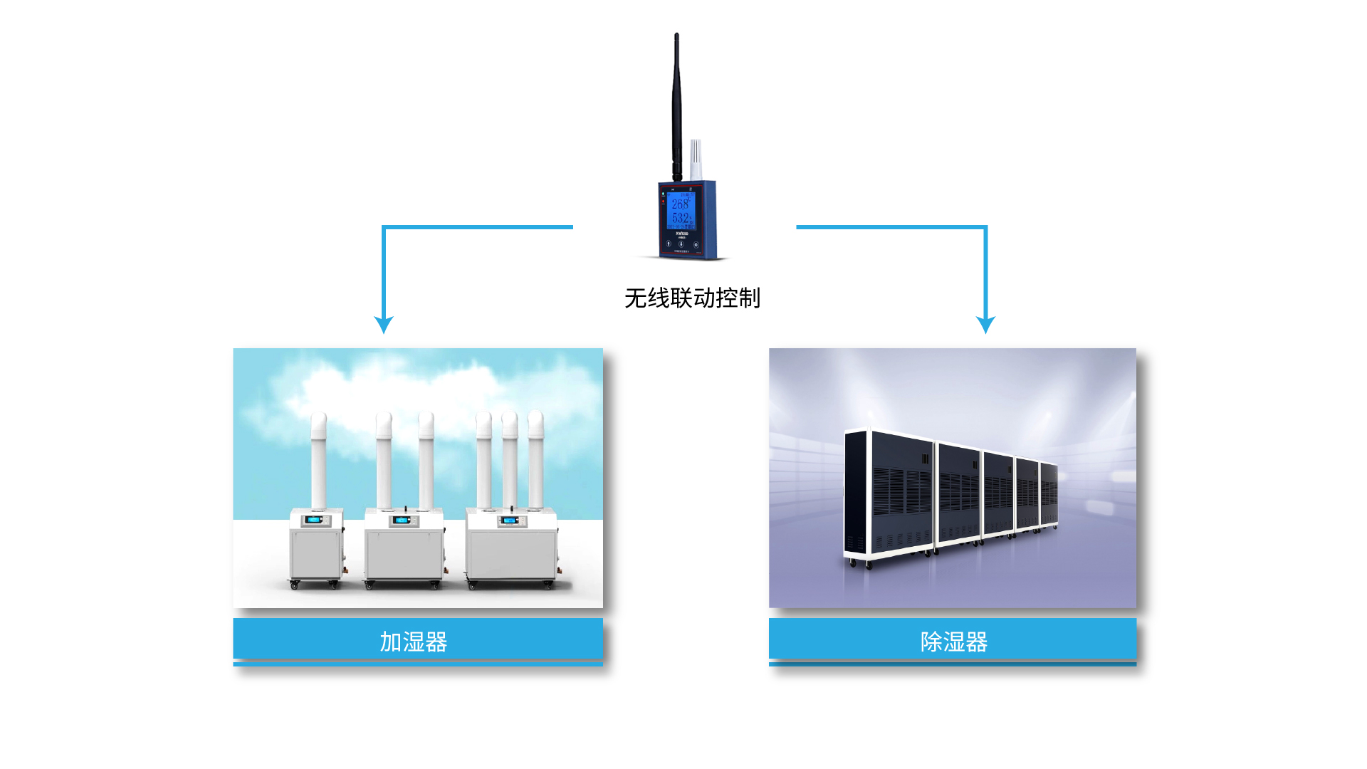 温湿度计检测超出阀值后,系统接收命令,自动启动除湿机和加湿机进行工作,达到阀值范围设备停止运行