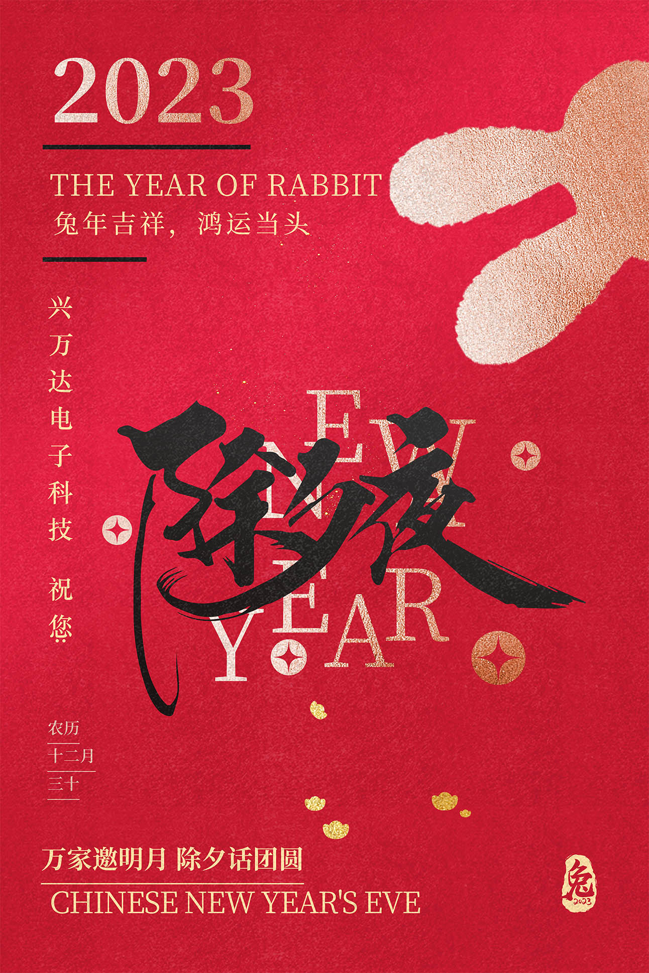 值此新春佳节来临之际,我仅代表公司感谢各位的的付出与拼博,感谢您与公司一起快乐的成长。同时也感恩每一位客户的信任与支持!因为有你们我们才能在行业的洪流中“兔”飞猛进。展望未来,就有希望。希望明年我们一如既往的努力,收获加倍的快乐,充实幸福的生活。