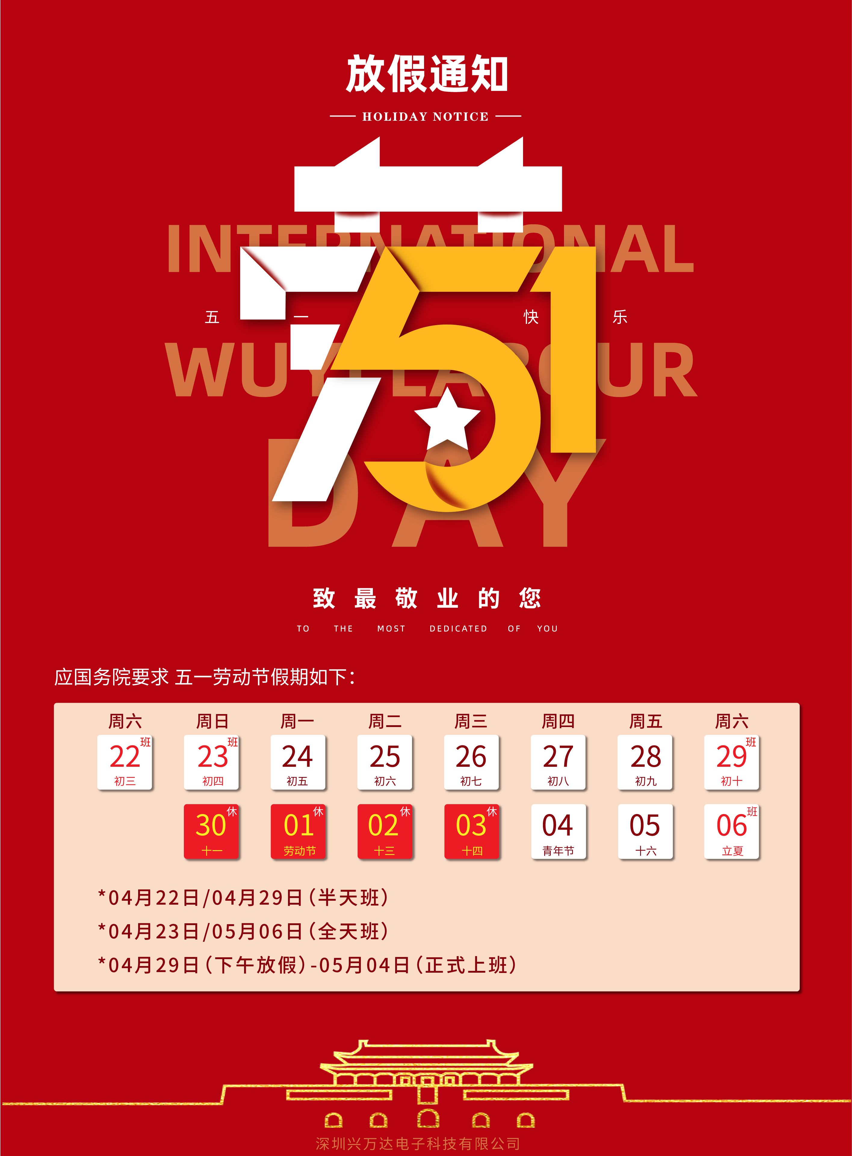 依据国家法定,我司将于:2023年劳动节4月29日放假,(共计5天)节假日期间,各地区、各部门之间要妥善安排好值班人员和安全等工作,注意自身安全及个人财产安全。