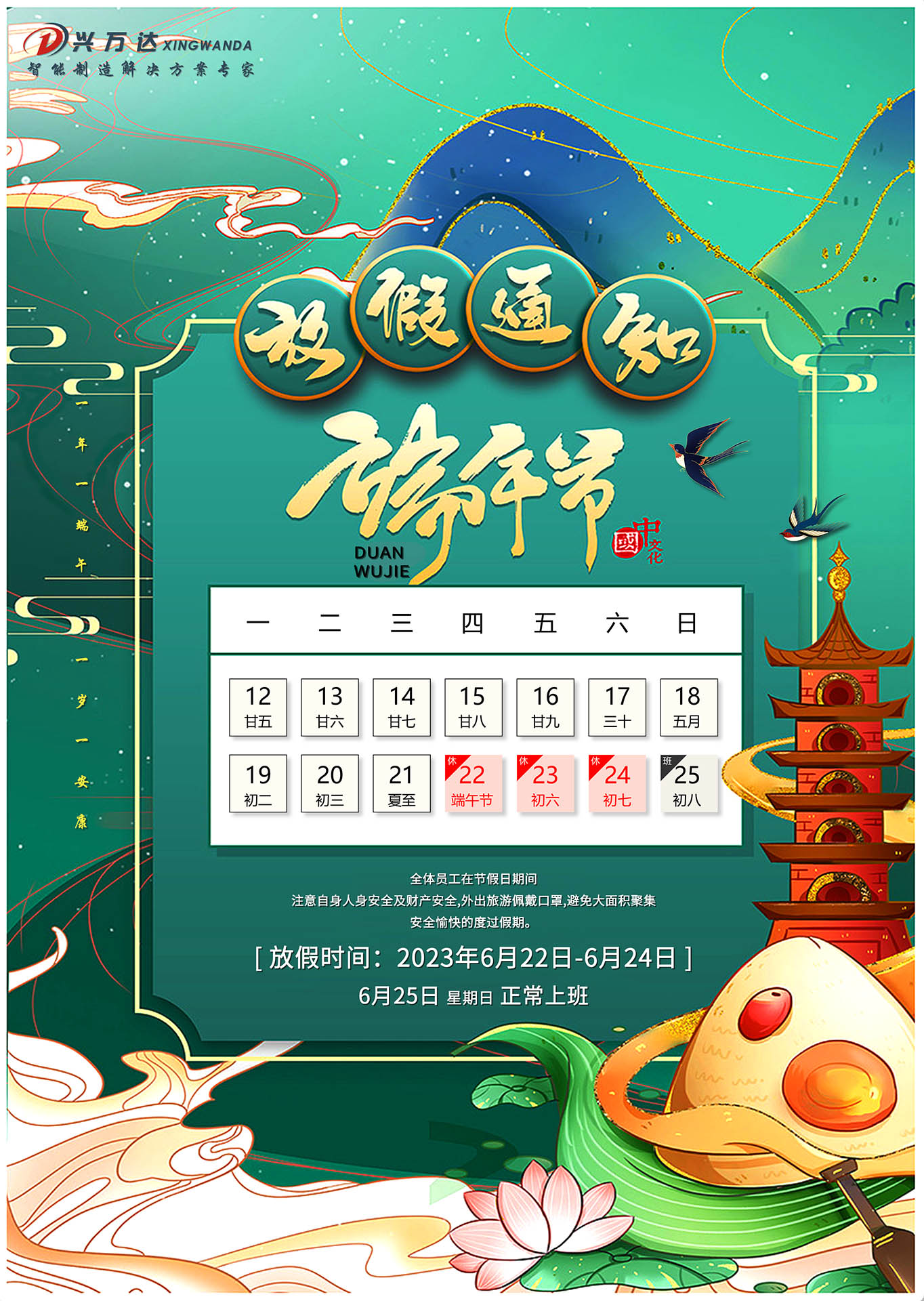 根据国务院办公厅的通知,现将我司2023年端午节放假事宜安排如下:
