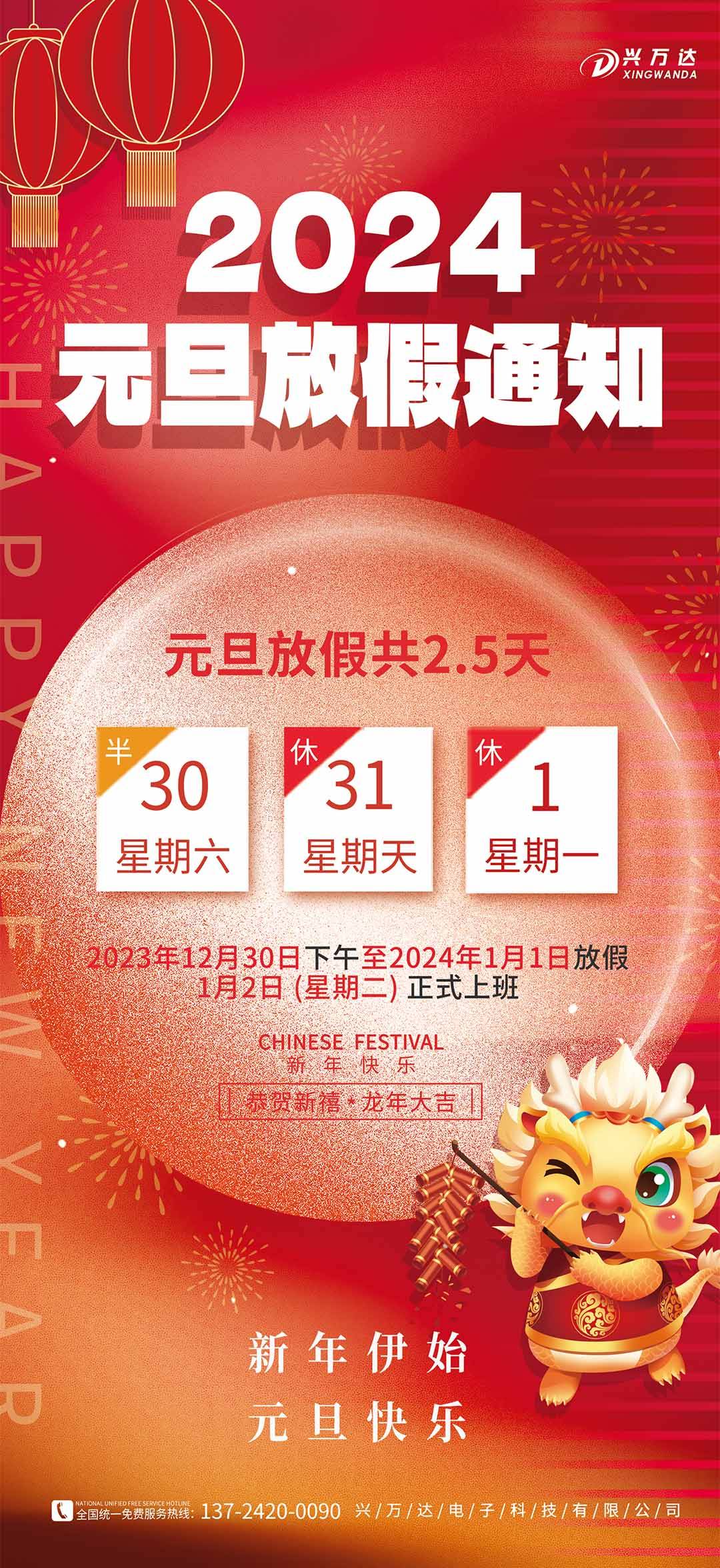 放假时间:公司于12月30日(星期六)至01月01日(星期一)放假共2.5天;01月02日(星期二)正常上班。